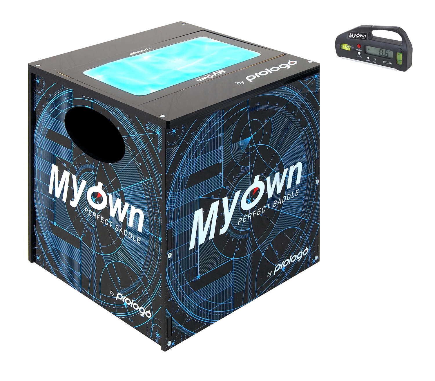 The set includes: measuring seat cube (includes gel a pad with a scale for measuring pelvic bones), Digital protractor for measuring spinal flexibility, advertising PVC panel and PVC banner PROLOGO