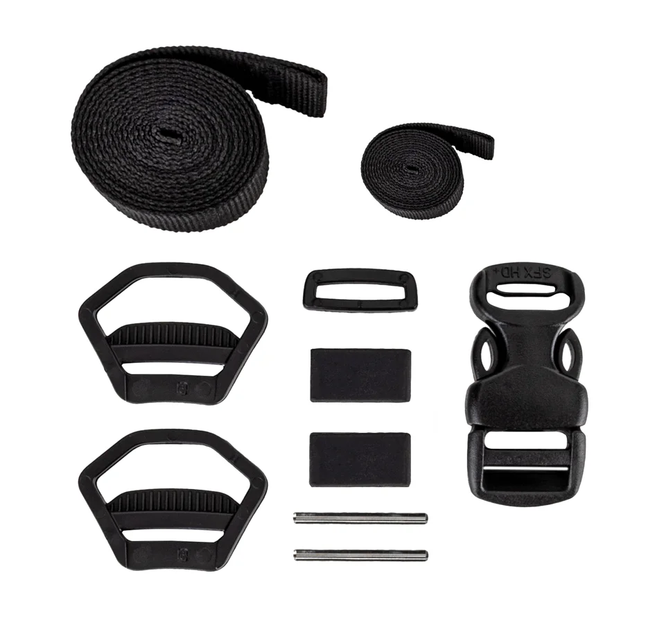 kratší a delší nylonový popruh, 2x rozdělovač, 2x fixační kolík, přezka,